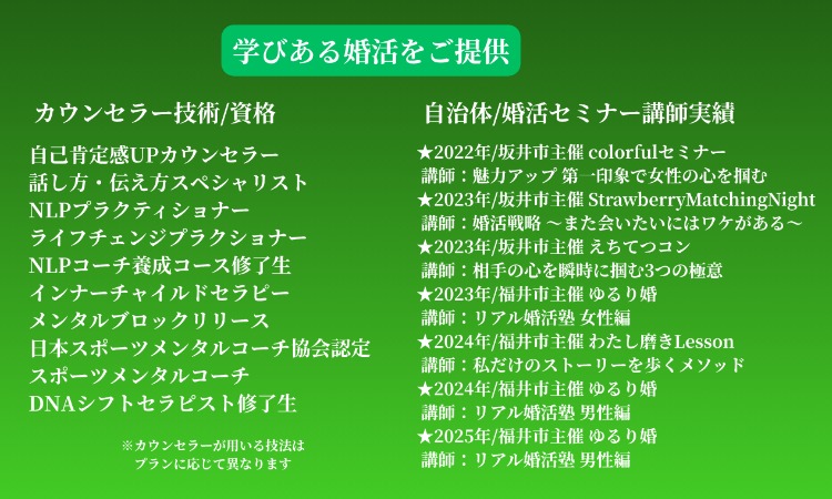 押し付ける助言や、SNSで検索すれば出てくるようなありきたりなアドバイスではなく、会話を通して気持ちや考えを整理し、自分で納得して選べるようにサポートする結婚相談所です。
