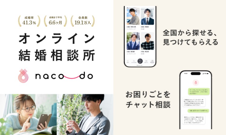 naco-doは、入会から成婚まですべてスマホで完結できるオンライン結婚相談所です。